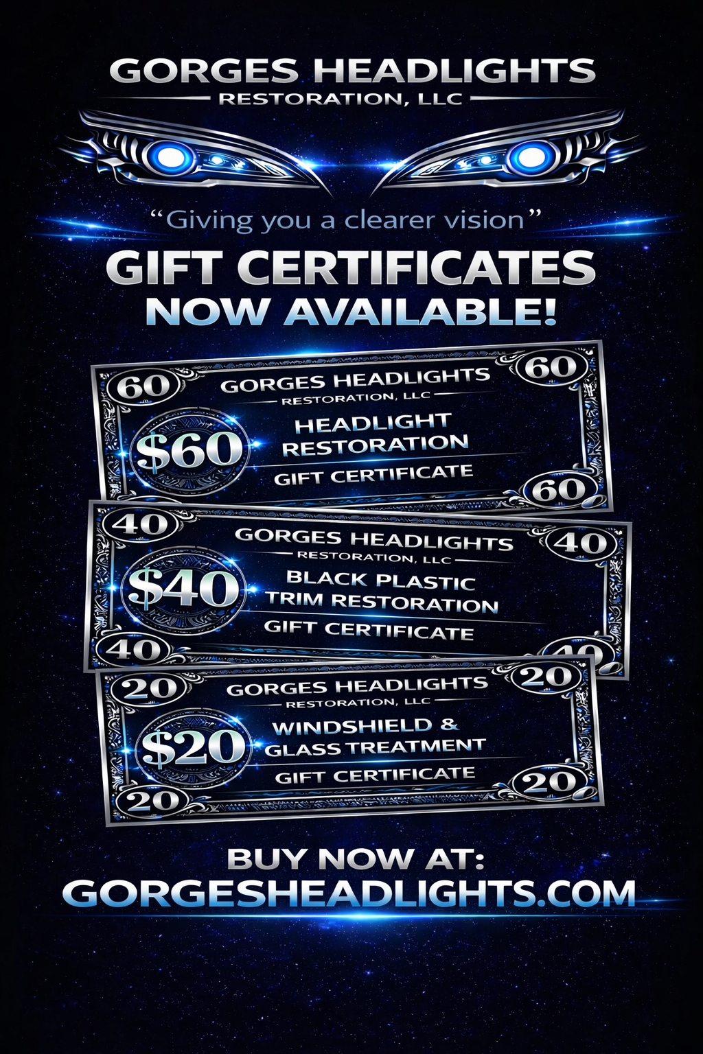 At Gorges Headlights Restoration, LLC, our promise is to provide every customer with honest, dependable, and high-quality service you can trust. We are committed to restoring your headlights with professional care, improving both safety and appearance, while delivering the convenience of mobile service right to your home or workplace. We take pride in our craftsmanship, attention to detail, and customer satisfaction—because you deserve results that are clear, lasting, and guaranteed.