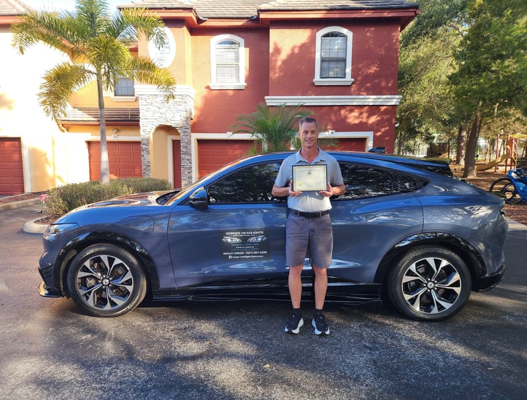 At Gorges Headlights Restoration, LLC, we bring clarity back to your vehicle with a certified mobile service including professional headlight restoration, exterior black plastic trim restoration, and windshield & glass treatment. Wesley is professionally trained and certified by Detail King since 2016. 10 years of professional, hands-on experience, skills, and knowledge when it comes to your detailing needs. Located in beautiful Palm Harbor, Wesley provides a mobile service and comes to your home or workplace for your convenience.