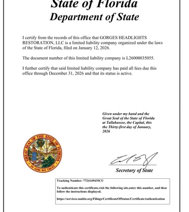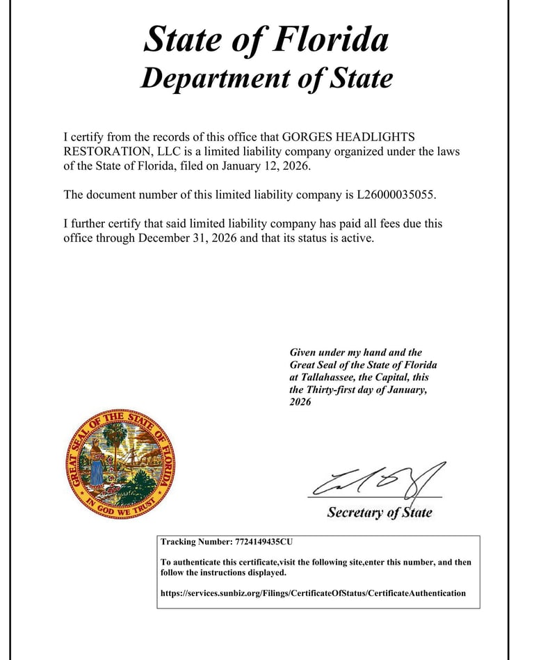 Gorges Headlights Restoration, LLC has an official legal LLC from the State of Florida and the owner, Wesley Gorges, has an auto detailing certification from Detail King since 2016. Hire the best!